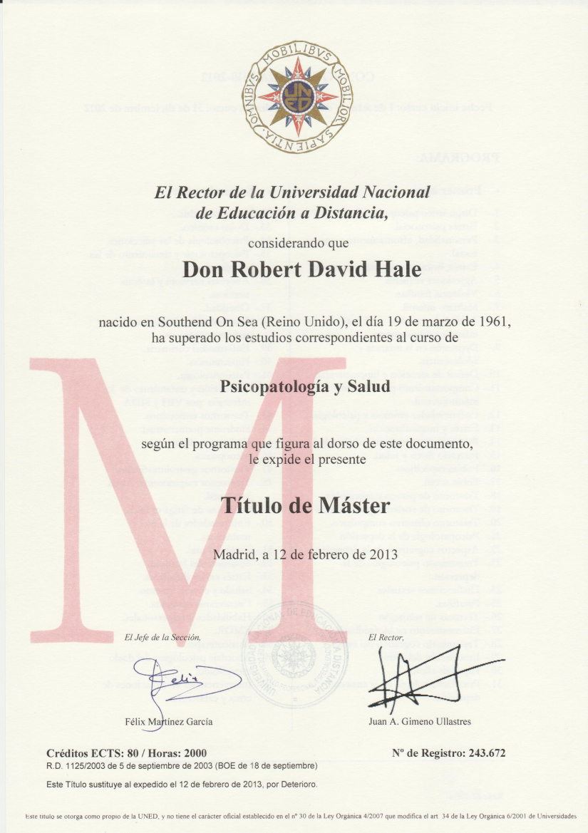 - Maestría en Psicopatología y Salud – Universidad Nacional de Educación a Distancia, Madrid – 2013.