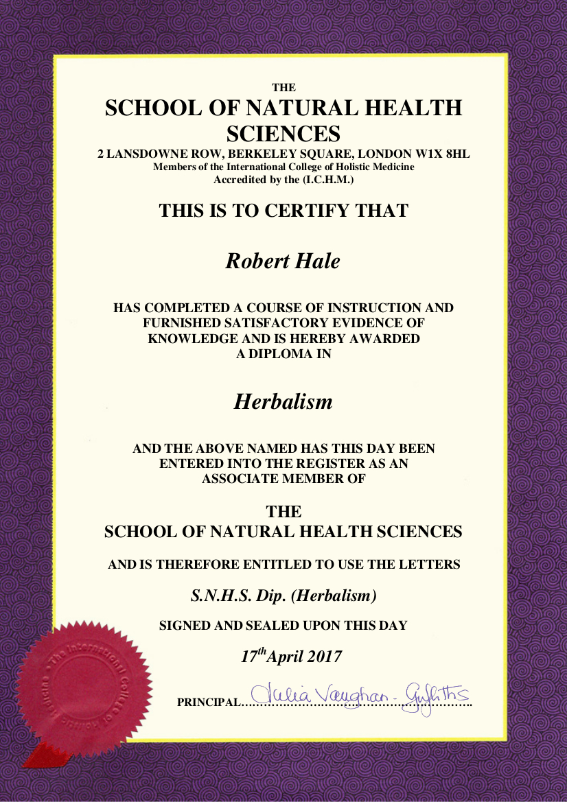 - Diploma en Fitoterapia – School of Natural Health Sciences, Reino Unido – 2017.