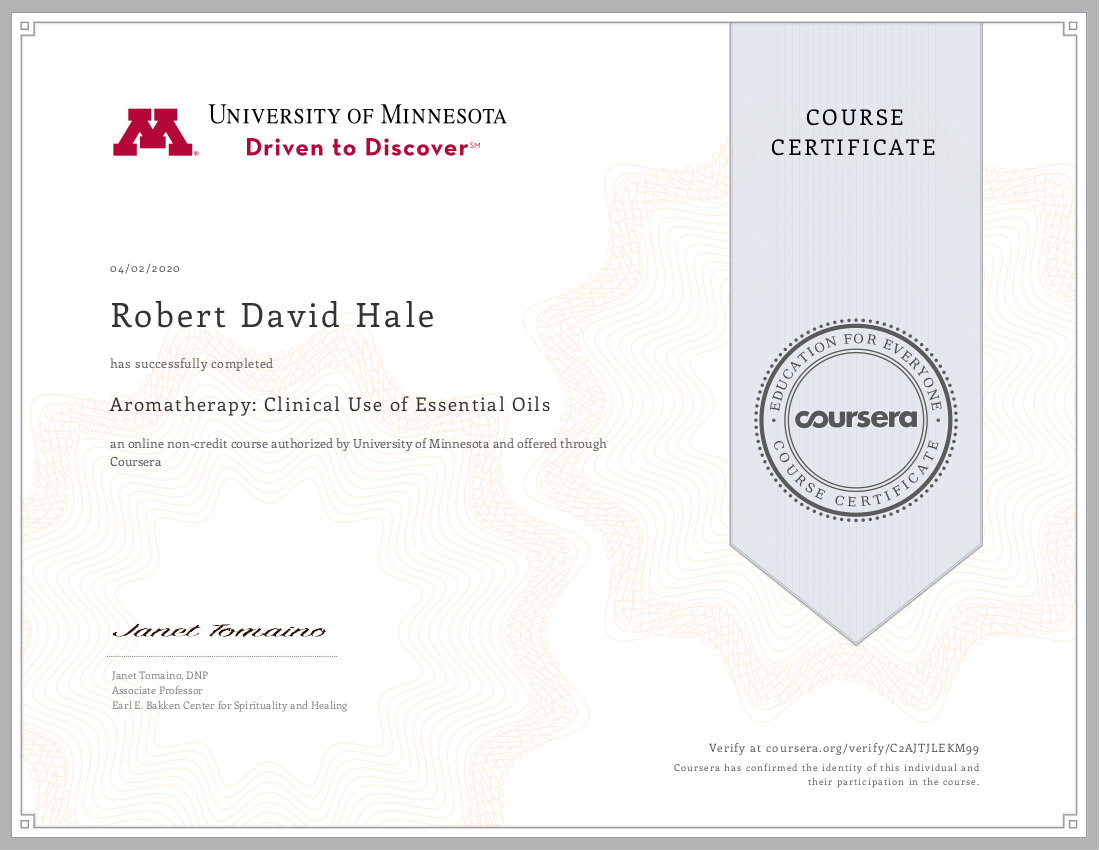 - Certificado de finalización del curso: Aromaterapia – Universidad de Minnesota, EE. UU. – 2020.