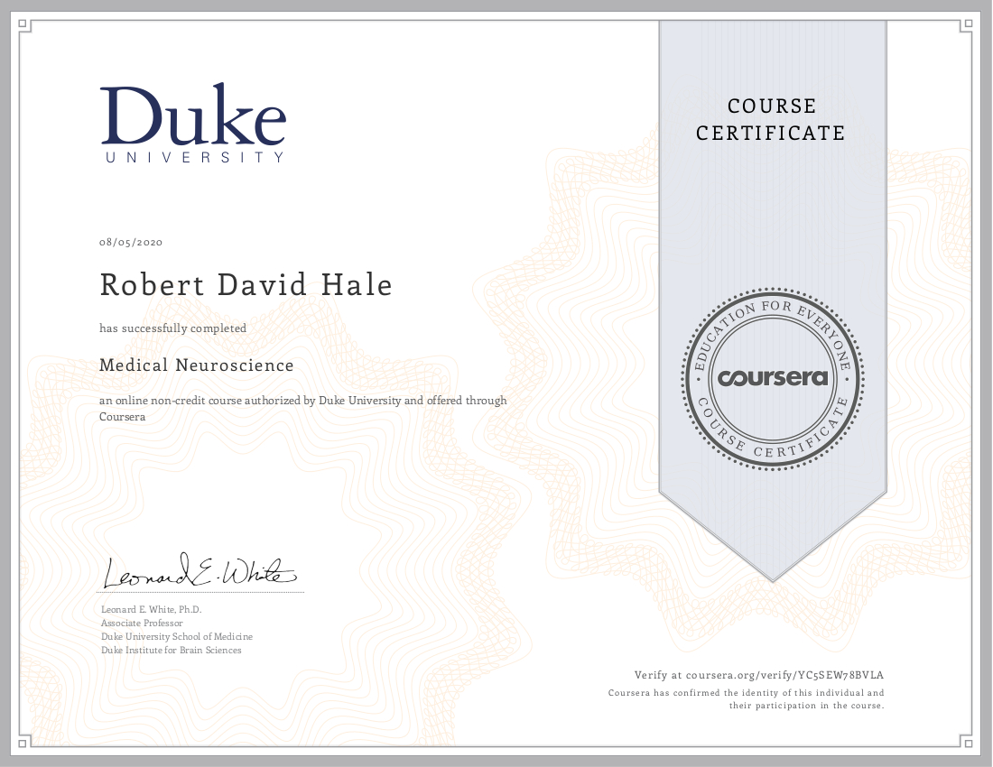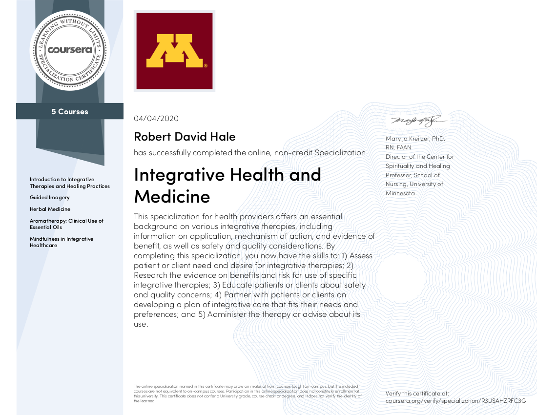 - Certificado de finalización del curso: Salud y Medicina Integral – Universidad de Minnesota, EE. UU. – 2020.