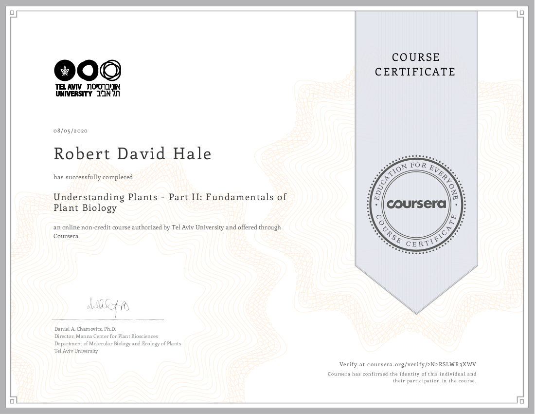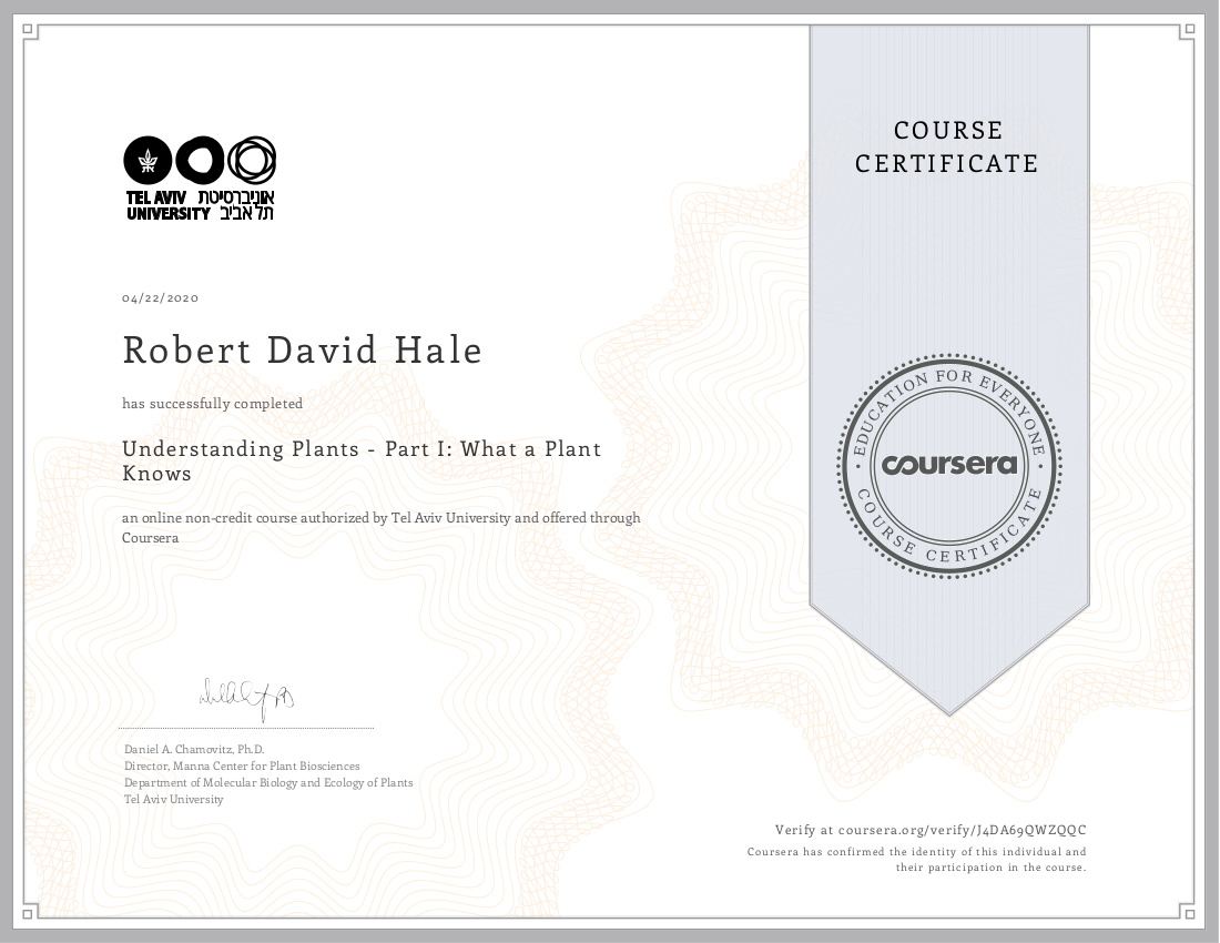 - Certificado de finalización del curso: Medicina Botánica – Universidad de Minnesota, EE. UU. – 2020.