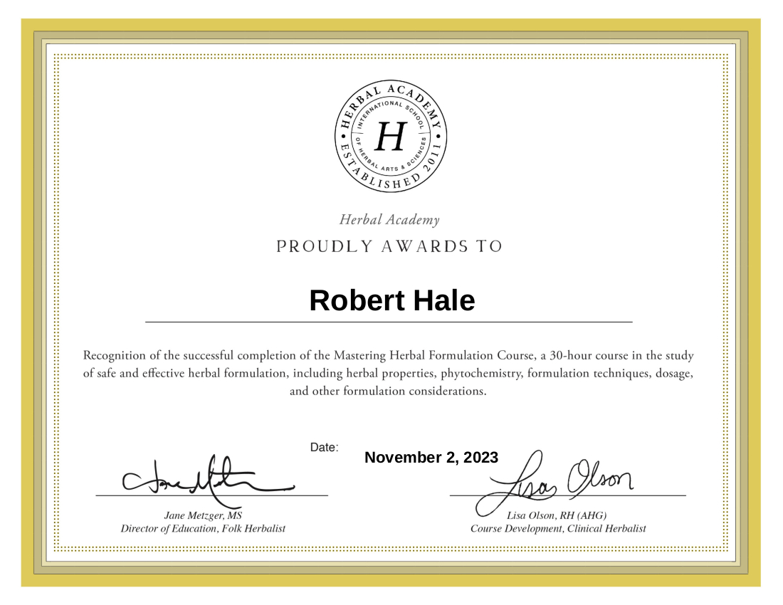 - Certificado de finalización del curso: Formulación Herbal – Herbal Academy, EE. UU. – 2023.