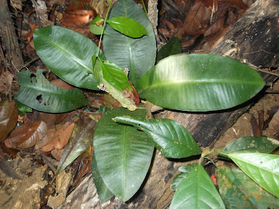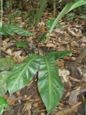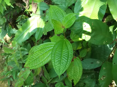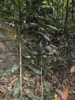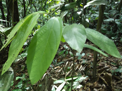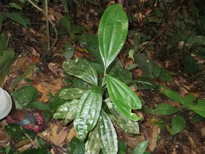 The photograph below is of a plant indicated to me by Ah Kau as Sampu Gemur on my second visit in 2019. On the same visit he had already indicated to me by the same name the plant in the second photo above, which looks the same as the plant he indicated to me by that name in 2013 (first photo above). When I pointed out that the plant in the photo below has a diffirent leaf, he explained that there were different varieties of the plant known to him as Sampu Gemur.