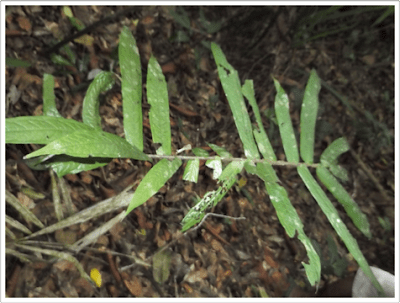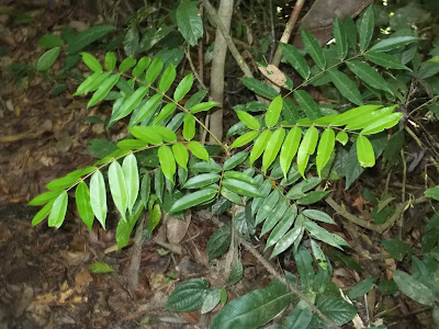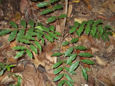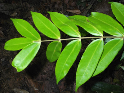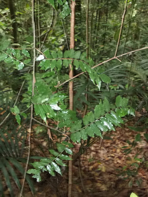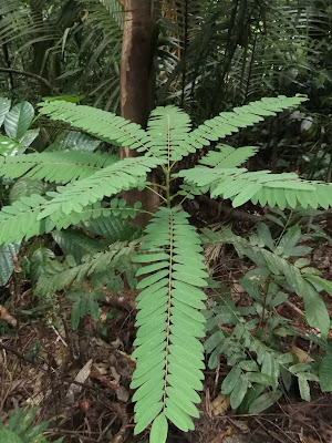 As far as this first plant is concerned, when I google “penyerit petai”, I am shown results for “Penyakit Petai”, one of which is this Wikipedia page about a plant called Pokok Petai (Parkia speciosa Hassk.) Ong et al. (2011) give the native name of Parkia speciosa simply as Petai. Penyakit seems too close to my spellings to be a coincidence. From the above Wikipedia page I learn that penyakit means “disease” and can be used with other words to specify the kind of disease or organ affected. I also learn that petai means “banana”, here in the sense of being shaped like a banana. In the case of Pokok Petai, this refers to the shape of the clustered seed pods born by the tree, which contain bean-like seeds. I did not see seed pods on the plant Ah Kau showed me. It may have been the wrong time of year. But secondly, Google images of the leaves of Parkia speciosa, while superficially similar to Ah Kau’s plant, on closer inspection are quite different.